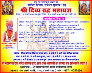 रायपुर। छत्तीसगढ़ राज्य के प्राचीन शक्तिपीठ मां महामाया माता मंदिर सार्वजनिक न्यास समिति द्वारा माघ महीने के गुप्त नवरात्रि में 10 फरवरी से श्री दिव्य रुद्र महायज्ञ का आयोजन किया जा रहा है। मंदिर समिति के अध्यक्ष आनंद शर्मा, सचिव व्यास नारायण तिवारी, वरिष्ठ सदस्य शेखर दुबे, न्यासी विजय कुमार झा ने बताया है कि इसके पूर्व गुप्त नवरात्रि में श्रीमद् देवी भागवत का भव्य आयोजन किया गया था। इस गुप्त नवरात्रि 10 फरवरी से 18 फरवरी तक शिव और शक्ति के रूप में शिवजी का रुद्र महायज्ञ प्रारंभ हो रहा है। प्रथम चरण में 10 फरवरी को प्रातः 10 बजे भव्य कलश यात्रा मंदिर परिसर से अमीनपारा, नीली चौक, लाखे नगर, सारथी चौक, होते हुए तात्यापारा चौक, से प्राचीन कंकाली तालाब पहुंचकर जल ग्रहण कर महिलाएं शीतला मंदिर तथा शीतला बाजार होते हुए मंदिर प्रांगण प्रवेश करेंगे। रविवार से अग्निमंथन, अग्नि प्रज्वलन, बेदी पूजन, देव आवाहन, रुद्राभिषेक पूजन पश्चात हवन प्रारंभ होगा। 12 फरवरी से 16 फरवरी तक नित्य प्रात 8 बजे से 11 बजे तक रुद्राभिषेक पूजन एवं 11 बजे से 12:30 बजे तक हवन कार्यक्रम संपन्न होंगे। प्रतिदिन 12:30 से 3:00 बजे तक विश्राम पश्चात पुनः हवन, आरती प्रसाद, संध्या 3 बजे से 6 बजे तक होगा। 18 फरवरी को यज्ञ समाप्ति, पूर्णहुति महाआरती, सहस्त्रधारा, ब्राह्मण भोजन, भंडारा प्रसादी से संपन्न होगा। मंदिर न्यास समिति ने धर्म प्रिय श्रद्धालुओं, कार्यकर्ताओं से अपील की है कि अधिक से अधिक संख्या में इस महायज्ञ में शामिल होकर यज्ञ वेदी की प्रतिदिन सुबह शाम परिक्रमा कर पूण्य लाभ प्राप्त करें।