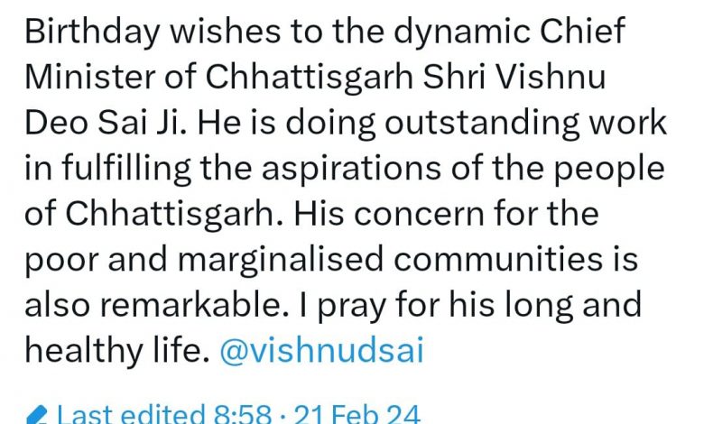 छत्तीसगढ़ के ओजस्वी मुख्यमंत्री को जन्मदिन की हार्दिक शुभकामनाएं, प्रधानमंत्री नरेन्द्र मोदी ने एक्स पर पोस्ट किया