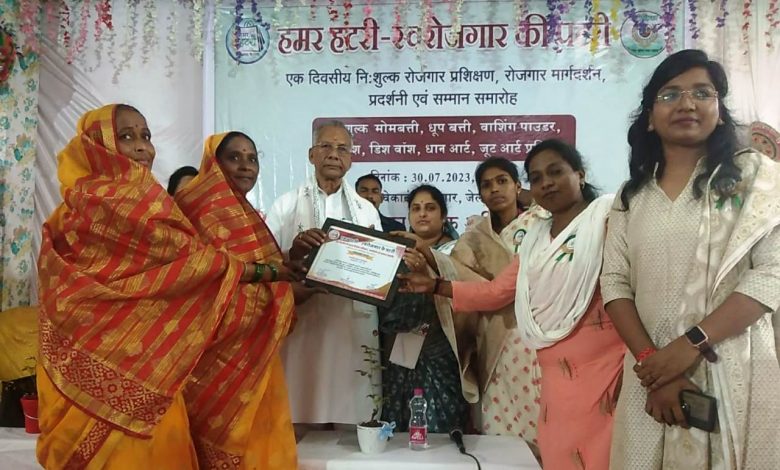 रायपुर, गृह मंत्री श्री ताम्रध्वज साहू दुर्ग जिले के स्वामी विवेकानंद सभागार मंे आयोजित ‘हमर हटरी स्वरोजगार की पटरी’ निःशुल्क रोजगार प्रशिक्षण एवं सम्मान समारोह में शामिल हुए। हमर हटरी स्वरोजगार की पटरी की महिलाओं ने मंत्री श्री साहू को स्वयं से तैयार की गई खुमरी और मटपरई शिल्प भेंट किए। मंत्री ने इस मौके पर अलग-अलग विधाओं के शिल्पकारों एवं उत्कृष्ट कार्य करने वालों को प्रशस्ति पत्र देकर सम्मानित किया। गौरतलब है कि हमर हटरी स्वरोजगार की पटरी का उद्देश्य बेरोजगार एवं अप्रशिक्षित महिला एवं युवा को प्रशिक्षित कर रोजगार व स्वरोजगार के लिए तैयार करना है।