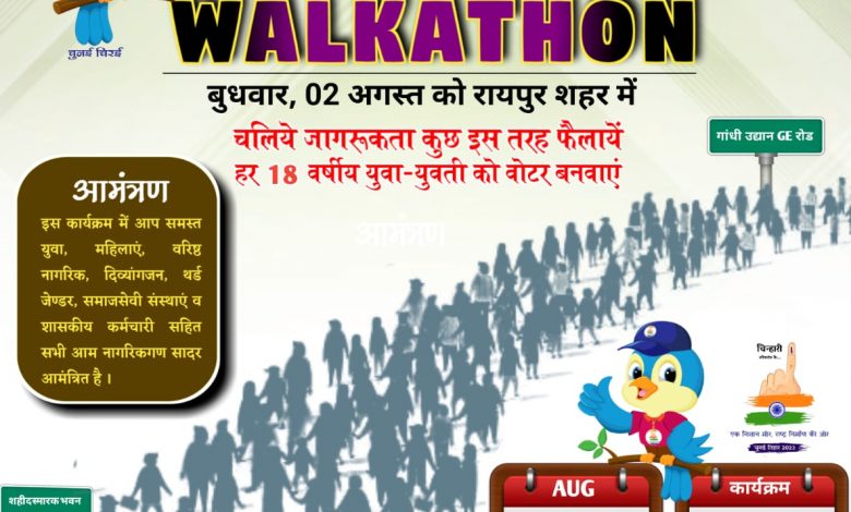 मुख्य निर्वाचन पदाधिकारी श्रीमती रीना बाबासाहेब कंगाले ने शहर के युवाओं, महिलाओं, वरिष्ठ नागरिकों, दिव्यांगों, तृतीय लिंग समुदाय के लोगों, समाज सेवी संस्थाओं तथा शासकीय अधिकारियों-कर्मचारियों सहित सभी नागरिकों से इसमें भाग लेने की अपील की है। वॉकेथान 2 अगस्त को सवेरे सात बजे जी.ई. रोड स्थित गांधी उद्यान चौक से शुरू होकर शहीद स्मारक भवन में समाप्त होगी।