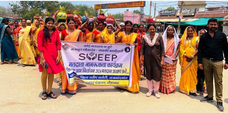 जिले में स्वसहायता समूह की महिलाएं विभिन्न कार्यक्रमों के माध्यम से ग्रामीण मतदाताओं को मतदान दिवस 26 अप्रैल को मतदान केन्द्र पहुंचकर मताधिकार का उपयोग करने के लिए प्रेरित कर रही है। अविभाजित राजनांदगांव जिले के सभी विकासखंडों में विगत 7 दिवस में ग्राम बागनदी, मोहला, भर्रीटोला, देवरसूर, कुदुम्कासा, जोबटोला, देवकट्टा, रूवाताला, मुसराकला, रामगढ़, आमाटोला, हाथीकन्हार, सांकरदाहरा, उसरीबोड़, मार्कनपुर सहित 89 से अधिक ग्रामों में लगभग 15 हजार से अधिक स्वसहायता समूह की महिलाओं द्वारा मतदाता जागरूकता कार्यक्रम अंतर्गत ग्राम संगठन स्तर पर वोट वचन का शपथ लिया गया और शपथ लेने का कार्य निरंतर जारी है। महिला स्वसहायता समूह की सदस्यों द्वारा मतदान दिवस 26 अप्रैल 2024 को लोकसभा निर्वाचन में वोट देकर अपने मताधिकार का उपयोग करने, साथ ही अपने परिवार, रिश्तेदारों एवं पड़ोसियों को शत-प्रतिशत वोट डालने के लिए प्रेरित करने का वोट वचन का शपथ ले रहीं है। महिलाओं द्वारा ग्रामीणों को लोकतंत्र में मतदान के अधिकार तथा मतदान का उपयोग करने के संबंध में ग्रामीणों को प्रेरित और शत प्रतिशत मतदान के लिए जागरूक किया जा रहा है।