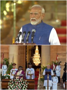 *रायपुर/दिल्ली।* प्रधानमंत्री नरेंद्र मोदी ने आज देश के पन्द्रहवें प्रधानमंत्री के रूप में शपथ ली। महामहिम राष्ट्रपति श्रीमती द्रौपदी मुर्मू ने राष्ट्रपति भवन में आयोजित शपथ ग्रहण समारोह में पीएम मोदी को पद एवं गोपनीयता की शपथ दिलाई। इस दौरान केंद्रीय मंत्रिपरिषद का भी शपथ ग्रहण हुआ और सदस्यों ने एनडीए सरकार में मंत्री पद की शपथ ली। मुख्यमंत्री विष्णु देव साय भी इस भव्य शपथ ग्रहण समारोह के साक्षी बने। वे अपने मंत्रिमंडल के सदस्यों, छत्तीसगढ़ के नवनिर्वाचित सांसदों एवं विधायकों के साथ इस समारोह में उपस्थित रहे।