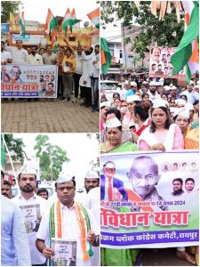 इसी तरह डॉक्टर खूबचंद बघेल ब्लॉक के दंतेश्वरी मंदिर गुरु घासीदास ब्लॉक के खम्हारडीह पंडित जवाहरलाल नेहरू ब्लॉक के राठौर चौक लेफ्टिनेंट अरविंद दीक्षित ब्लॉक के बैरन बाजार वीरांगना अवंती बाई ब्लॉक के सरदार पटेल चौक में यात्रा निकाली गई।