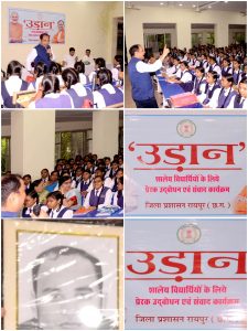 उड़ान कार्यक्रम में जिला पंचायत सीईओ श्री विश्वदीप ने अपने स्कूल के दिनों की पढ़ाई को याद करते हुए पुराने अनुभव साझा किए। उन्होंने कहा कि चाहे इतिहास हो, चाहे गणित का विषय मेरे स्कूल के पढ़ाई के समय में शिक्षक ने विस्तार पूर्वक और बेहतर तरीके से पढ़ाए है। कोई भी चीज को रटने से बेहतर हैं कि समझकर पढ़ें। इससे बेसिक चीजों का ज्ञान हमेशा रहता है। सोचने और समझने की क्षमता का भी विकास होता है। उन्होंने कहा कि सपने बड़े पालिए, इससे निश्चित ही नया आयाम मिलेगा। उ इस अवसर पर समग्र शिक्षा समन्वयक श्री के.एस. पटले, स्कूल प्राचार्य, शिक्षक समेत बड़ी संख्या में स्कूल के बच्चे उपस्थित थे।