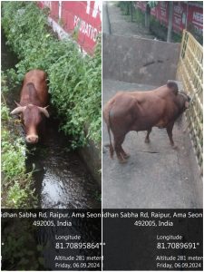 रायपुर – आज विधानसभा मार्ग आमासिवनी क्षेत्र के पास के नाले के समीप के रहवासी क्षेत्र के निवासियों ने रहवासी क्षेत्र के नाले में अचानक एक मवेशी के गिर जाने की जानकारी नगर पालिक निगम रायपुर को दी