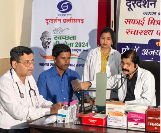 रायपुर । स्वच्छ भारत अभियान और 17 सितंबर से 2 अक्टूबर तक चलने वाले “स्वच्छता ही सेवा 2024” पखवाड़े के तहत डॉ अजय सहाय एवं उनकी टीम द्वारा सफाई कर्मियों के स्वास्थ्य परीक्षण के लिए दूरदर्शन केन्द्र रायपुर में एक विशेष शिविर का आयोजन किया गया। इस शिविर में सफाई कर्मियों के अलावा केंद्र के अधिकारियों एवं कर्मचारियों का भी स्वास्थ्य परीक्षण किया गया। सम्पूर्ण चेकअप के साथ साथ सभी की ईसीजी एवं ब्लड शुगर जांच भी की गई। आवश्यकतानुसार दवाइया भी निःशुल्क प्रदान की गईं।