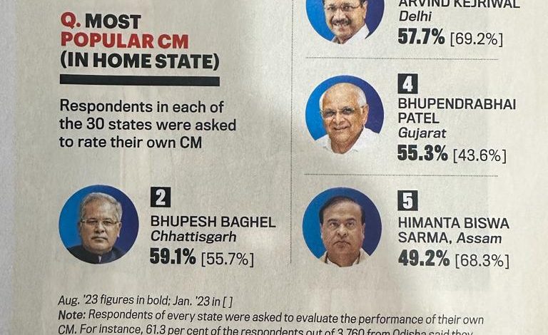 छत्तीसगढ़ सरकार की किसान हितैषी एवं आम जनता की भलाई के लिए संचालित योजनाओं से शहर से लेकर ग्रामीण क्षेत्र के बड़े तबके में जबरदस्त खुशहाली आई है जिससे श्री बघेल की लोकप्रियता बढ़ी है। सुदृढ़ ग्रामीण अर्थव्यवस्था से शहरी अर्थव्यवस्था भी समृद्ध हुई है। इसके साथ ही नागरिक सुविधाओं में बेहतरी के लिए किये गये कार्यों से शहरी क्षेत्रों में अच्छा माहौल है जिसका असर भूपेश सरकार की लोकप्रियता में दिख रहा है। सबसे बड़ी बात यह है कि श्री बघेल ने छत्तीसगढ़िया अस्मिता पर लगातार बात की, यह बात लोगों के दिलों में घर कर गई है। वे जनता की भाषा में जनता की रुचि की ही बातें करते हैं इसके चलते उनकी लोकप्रियता में जबरदस्त इजाफा हो रहा है। इंडिया टूडे के सर्वे में लोकप्रियता के मामले में ओडिशा के मुख्यमंत्री पहले स्थान पर, दिल्ली के मुख्यमंत्री तीसरे स्थान पर हैं। गुजरात के मुख्यमंत्री चौथे, असम के मुख्यमंत्री पांचवे स्थान पर हैं।