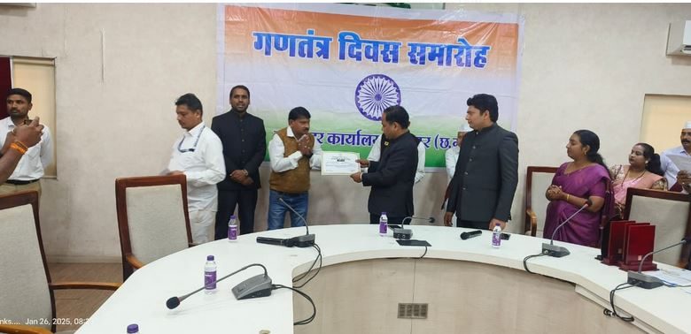 रायपुर. कार्यालय कलेक्टर जिला रायपुर (छ.ग.) गणतंत्र दिवस समारोह 2025 मे प्रभारी खनिज निरीक्षक रायपुर छ.ग. रघुनाथ भारद्वाज को शासकीय कार्यों के क्रियान्वयन में सराहनीय योगदान के लिए प्रशस्ति पत्र प्रदान कर कलेक्टर महोदय डॉ. गौरव कुमार सिंह (IAS) कलेक्टर जिला रायपुर ने सम्मानित किया