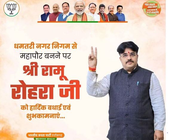 बीजेपी छत्तीसगढ़ ने X में लिखा, धमतरी नगर निगम से महापौर बनने पर रामू रोहरा जी को हार्दिक बधाई एवं शुभकामनाएं।
