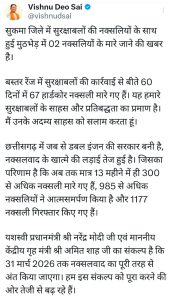 मुख्यमंत्री श्री साय ने कहा कि यशस्वी प्रधानमंत्री श्री नरेंद्र मोदी जी और केंद्रीय गृह मंत्री श्री अमित शाह जी का संकल्प है कि 31 मार्च 2026 तक छत्तीसगढ़ से नक्सलवाद का संपूर्ण रूप से अंत किया जाएगा। उन्होंने कहा कि राज्य सरकार और सुरक्षाबलों की संयुक्त रणनीति से नक्सलवाद पर निर्णायक प्रहार किया जा रहा है। यह अभियान तब तक जारी रहेगा जब तक नक्सलवाद की समस्या पूरी तरह समाप्त नहीं हो जाती। उन्होंने कहा कि छत्तीसगढ़ सरकार शांति, सुरक्षा और विकास के पथ पर तेजी से आगे बढ़ रही है, और यह सफलता इसी दृढ़ संकल्प का प्रमाण है।