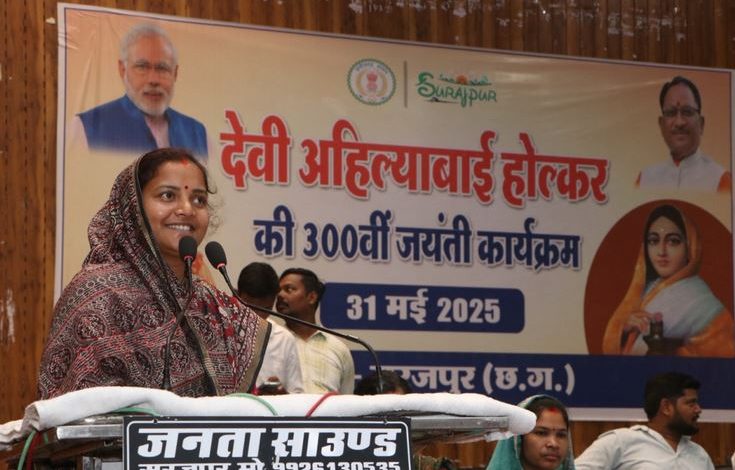 रायपुर, महिला एवं बाल विकास और समाज कल्याण मंत्री श्रीमती लक्ष्मी राजवाड़े के मुख्य आतिथ्य में सूरजपुर जिले के ऑडिटोरियम में रानी अहिल्याबाई होल्कर की 300वीं जयंती पर भव्य समारोह का आयोजन किया गया। श्रीमती राजवाड़े ने इस अवसर पर प्रदेशवासियों को शुभकामनाएं देते हुए रानी अहिल्याबाई होल्कर के जीवन और कर्तृत्व को नारी शक्ति की प्रेरणा बताया।