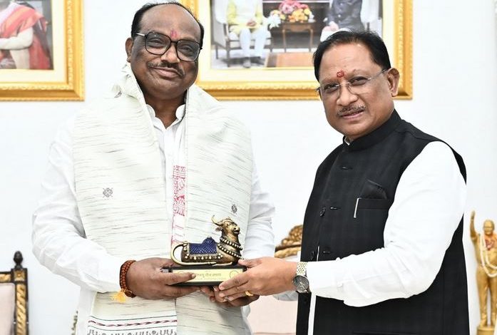 मुख्यमंत्री श्री साय ने श्री उइके का पारंपरिक कोसा वस्त्र और बेल मेटल से निर्मित स्मृति चिह्न भेंट कर आत्मीय स्वागत किया। इस अवसर पर दोनों नेताओं के बीच छत्तीसगढ़ के जनजातीय क्षेत्रों के समग्र विकास, जनजातीय युवाओं के सशक्तिकरण, शिक्षा, स्वास्थ्य, एवं आधारभूत संरचना से जुड़े विषयों पर विस्तार से चर्चा हुई।