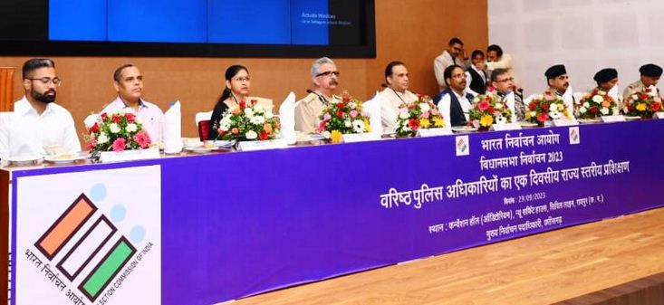 मुख्य निर्वाचन पदाधिकारी कार्यालय द्वारा भारत निर्वाचन आयोग के निर्देशानुसार छत्तीसगढ़ में आगामी विधानसभा आम निर्वाचन-2023 के लिए राज्य के वरिष्ठ पुलिस अधिकारियों के लिए एक दिवसीय प्रशिक्षण का आयोजन किया गया। रायपुर के नवीन विश्राम भवन में आयोजित प्रशिक्षण के दौरान छत्तीसगढ़ के पुलिस महानिदेशक श्री अशोक जुनेजा, पश्चिम बंगाल के मुख्य निर्वाचन पदाधिकारी श्री आरिज आफताब और तमिलनाडू के मुख्य निर्वाचन पदाधिकारी श्री सत्यब्रत साहू ने निर्वाचन के दौरान सुरक्षा व्यवस्था के संबंध में प्रशिक्षण दिया। छत्तीसगढ़ के अतिरिक्त पुलिस महानिदेशक एवं स्टेट लेवल फोर्स को-ऑर्डिनेटर श्री विवेकानन्द सिन्हा, मुख्य निर्वाचन पदाधिकारी श्रीमती रीना बाबासाहेब कंगाले तथा स्टेट पुलिस नोडल ऑफिसर श्री ओ.पी. पाल भी इस दौरान उपस्थित थे।