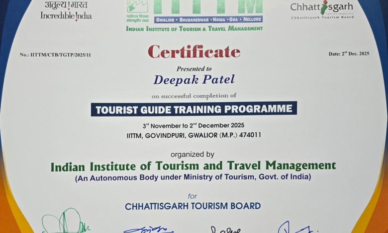 रायपुर, पर्यटन विभाग छत्तीसगढ़ के सौजन्य से भारतीय पर्यटन एवं यात्रा प्रबंधन संस्थान आईआईटीटीएम ग्वालियर में 45 युवाओं ने सफलतापूर्वक गाइड प्रशिक्षण का कार्यक्रम पूरा कर लिया है। पर्यटन एवं संस्कृति मंत्री श्री राजेश अग्रवाल ने प्रशिक्षणार्थियों को उनके उज्ज्वल भविष्य के लिए हार्दिक बधाई और शुभकामनाएं दी हैं।