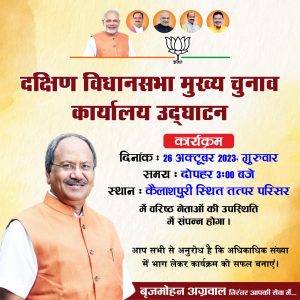 *भारतीय जनता पार्टी* दक्षिण विधानसभा का मुख्य चुनाव कार्यालय का उद्घाटन कल *26 अक्टूबर 2023 गुरुवार को दोपहर 3:00 बजे* पार्टी जेष्ठ-श्रेष्ठ नेताओं-कार्यकर्ताओ उपस्थिति में कैलाशपुरी स्थित तत्पर परिसर में संपन्न होगा ।