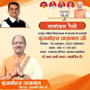 रायपुर दक्षिण विधानसभा क्षेत्र के *भाजपा प्रत्याशी माननीय श्री बृजमोहन अग्रवाल कल 30 अक्टूबर 2023 दिन सोमवार को प्रातः 11:00 बजे*