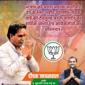 भारतीय जनता पार्टी को अपना अमूल्य आशीर्वाद देने के लिए शहीद चूड़ामणि नायक वार्ड की देवतुल्य जनता जनार्दन का हार्दिक आभार एवं कार्यकर्ताओं का अभिनंदन🙏🏻🙏🏻🙏🏻🙏🏻🙏🏻