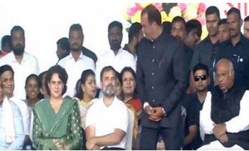 हैदराबाद. कांग्रेस अध्यक्ष मल्लिकार्जुन खड़गे, पूर्व अध्यक्ष सोनिया गांधी और राहुल गांधी तथा पार्टी महासचिव प्रियंका गांधी वाड्रा तेलंगाना के मुख्यमंत्री के रूप में अनुमुला रेवंत रेड्डी के शपथग्रहण समारोह में शामिल होने के लिए गुरुवार को हैदराबाद पहुंचे।