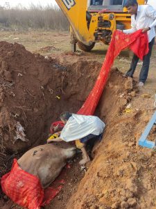 गौ माता की मृत्यु के पश्चात जेसीबी से गड्ढा खुदवा करके मिट्टी दिया गया